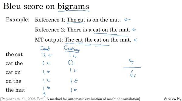 上述都只是关注单独的单词,在BLEU得分中,另外一种更科学的打分方法是bleu score on bigrams(二元词组),bigram的意思就是相邻的两个单词