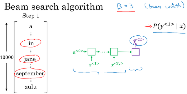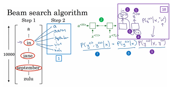 当想得到单词序列y<1>、y<2>一直到最后一个词总体的概率时,一次仅仅挑选一个词并不是最佳的选择。如果字典中有10,000个单词,翻译有10个词,可能的组合就有10,000的10次方这么多,从这样大一个字典中来挑选单词,句子数量非常巨大,大大增加了运算成本,降低运算速度,不可能去计算每一种组合的可能性