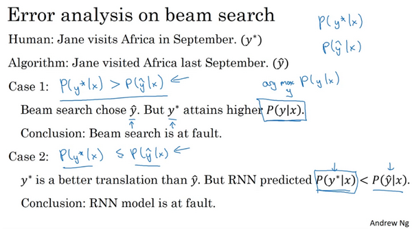 若P(y∗∣x)小于或等于P(y^∣x),y∗ 是比 y^更好的翻译结果,不过根据RNN模型的结果,P(y∗) 是小于P(y^)的,即相比于y^,y∗成为输出的可能更小。因此在这种情况下是RNN模型出了问题