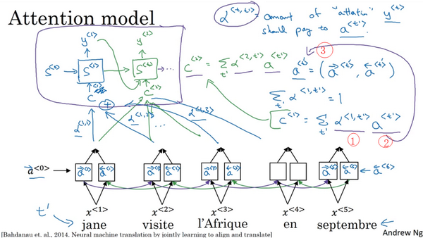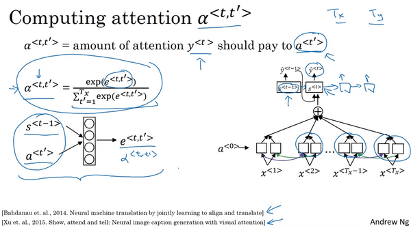 用状态S表示生成翻译。α<t,t′>是输出y^<t>在t′时对RNN单元花在a<t′>上的注意力权重因子。即在t处生成输出词应该花多少注意力在第t′个输入词上面