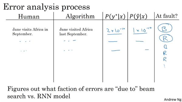 执行误差分析,得出束搜索算法和RNN模型出错的比例是多少。对开发集中每一个错误例子,即算法输出了比人工翻译更差的结果的情况,尝试确定是搜索算法出了问题,还是生成目标函数(束搜索算法使之最大化)的RNN模型出了问题。找到这两个部分中哪个是产生更多错误的原因