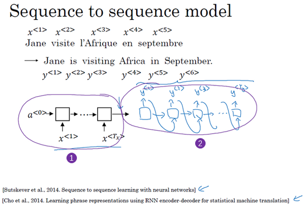 相比语言模型输出任意句子的概率,翻译模型会输出句子的英文翻译(编号5),这取决于输入的法语句子(编号6)。即估计一个英文翻译的概率,比如估计"Jane is visiting Africa in September."翻译的概率,这句翻译是取决于法语句子,"Jane visite I'Afrique en septembre.",这就是英语句子相对于输入的法语句子的可能性,是一个条件语言模型
