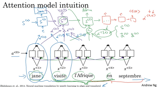 S^{< t>}$由原语句附近单元共同决定,注意力权重(attention weights)α<t,t′> 表示尝试生成第t个英文词时应该花多少注意力在第t′个法语词上面。直到最终生成<EOS>。离得越近,注意力权重越大,相当于当前的注意力区域有个滑动窗。c表示编码器激活函数在注意力权重加权后的结果,将c输入到解码器用来生成翻译语句, 同时上一个时间步输出的翻译结果也加入