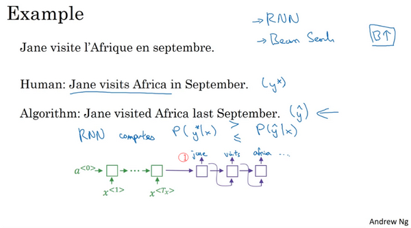 RNN(循环神经网络)实际上是个编码器和解码器(the encoder and the decoder),它会计算P(y∣x)。如对于句子:Jane visits Africa in September,将Jane visits Africa填入这里(上图编号1),忽略字母的大小写,后面也是一样,计算得到P(y∗∣x),P(y^∣x) 同样如此,然后比较一下这两个值哪个更大
