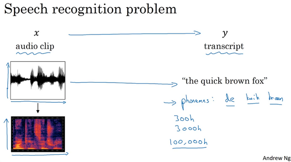 在end-to-end模型中,可以构建一个系统,通过向系统中输入音频片段(audio clip),然后直接输出音频的文本(a transcript)。这种方法要用一个很大的数据集,需要上千上万个小时的语音素材