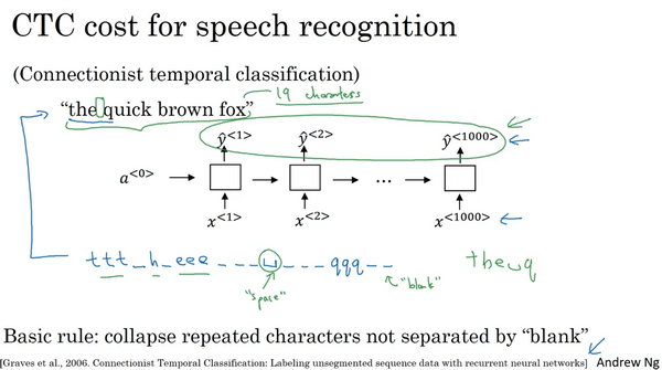 在语音识别中,通常输入的时间步数量(the number of input time steps)要比输出的时间步的数量(the number of output time steps)多出很多。如一段10秒的音频,并且特征(features)是100赫兹的,即每秒有100个样本,于是这段10秒的音频片段就会有1000个输入