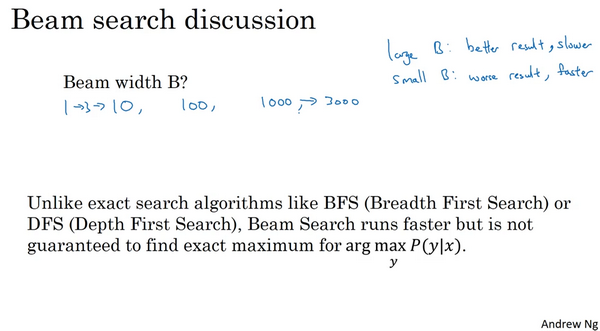 相对广度优先搜索(BFS, Breadth First Search algorithms),深度优先搜索(DFS, Depth First Search)这些精确的搜索算法(exact search algorithms),束搜索运行的更快,但是不能保证一定能找到argmax的准确的最大值