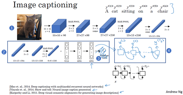 将图片输入到卷积神经网络中(一个预训练的AlexNet结构)(编号2),然后让其学习图片的编码,或者学习图片的一系列特征。去掉最后的softmax单元(编号3),这个预训练的AlexNet结构会输出4096维的特征向量,向量表示的就是这只猫的图片,这个预训练网络可以是图像的编码网络