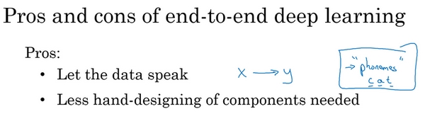 端到端学习只是让数据说话。如果有足够多的数据,不管从到最适合的函数映射是什么,如果训练一个足够大的神经网络,希望这个神经网络能自己搞清楚。使用纯机器学习方法,直接从到输入去训练神经网络,可能更能够捕获数据中的任何统计信息,而不是被迫引入人类的成见。例如在语音识别领域,早期的识别系统有这个音位概念,如果让学习算法学习它想学习的任意表示方式,而不是强迫使用音位作为表示方式,其整体表现可能会更好