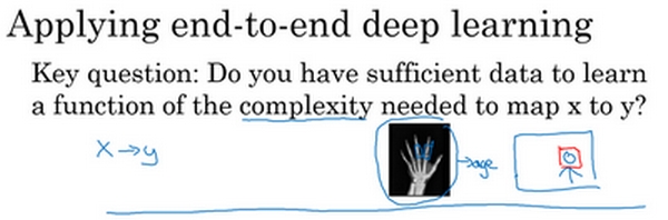决定是否使用端到端深度学习,关键的问题是是否有足够的数据能够直接学到从映射到足够复杂的函数。识别图中骨头位置是相对简单的问题,系统不需要那么多数据。但把手的X射线照片直接映射到孩子的年龄,直接去找这种函数,就是更为复杂的问题。如果用纯端到端方法,需要很多数据去学习