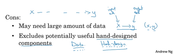 排除了可能有用的手工设计组件。当有大量数据时,手工设计不太重要,当没有太多的数据时,构造一个精心设计的系统,可以将人类对这个问题的很多认识直接注入到问题里,对算法很有帮助