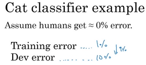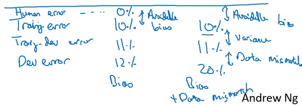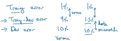 假设训练误差是1%,训练-开发集上的误差是9%,开发集误差是10%,存在方差,因为训练-开发集的错误率是在和训练集来自同一分布的数据中测得的,尽管神经网络在训练集中表现良好,但无法泛化到来自相同分布的训练-开发集