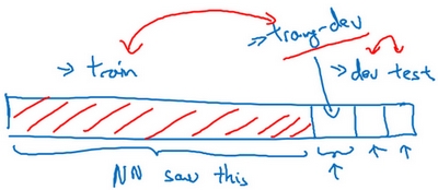 随机打散训练集,分出一部分训练集作为训练-开发集(training-dev),训练集、训练-开发集来自同一分布