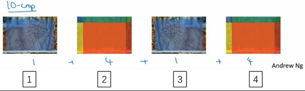 如把猫的图片复制四遍,包括两个镜像版本。如取中心的crop,然后取四个角落的crop,通过分类器来运行它
