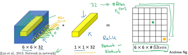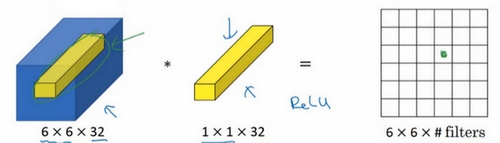 如果是一张6×6×32的图片,使用1×1过滤器进行卷积效果更好。1×1卷积所实现的功能是遍历这36个单元格,计算左图中32个数字和过滤器中32个数字的元素积之和,然后应用ReLU非线性函数