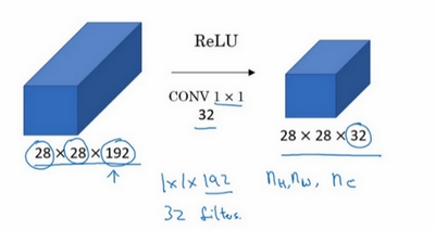假设一个28×28×192的输入层,如果通道数量很大,可以用32个大小为1×1×192的过滤器,使输出层为28×28×32,这就是压缩通道数()的方法