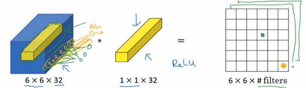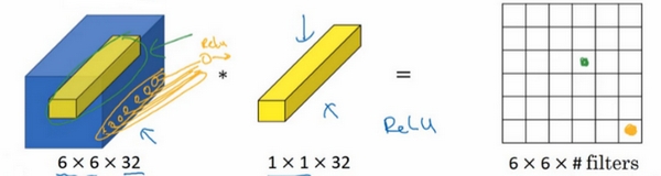1×1×32过滤器中的32个数字可以理解为一个神经元的输入是32个数字,这32个数字具有不同通道,乘以32个权重(将过滤器中的32个数理解为权重),然后应用ReLU非线性函数,输出相应的结果