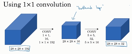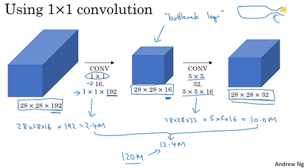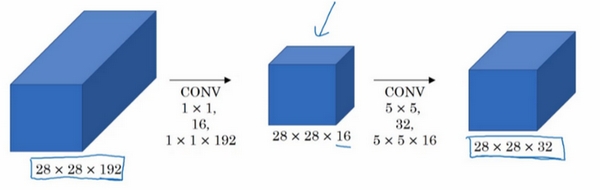 引入bottleneck layer之后,第一个卷积层计算成本:1×1×192×输出28×28×16,相乘结果约等于240万,第二个卷积层的计算成本是:28×28×32×5×5×16,计算结果为1000万,总次数是1204万,计算成本从1.2亿下降到了原来的十分之一