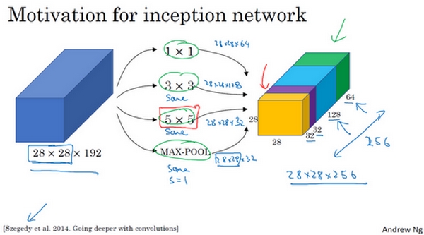 基本思想是Inception网络在单层网络上可以使用多个不同尺寸的filters,进行same convolutions,把各filter下得到的输出拼接起来。还可以将CONV layer与POOL layer混合,同时实现各种效果,但是要注意使用same pool。Inception Network不需要人为决定使用哪个过滤器或者是否需要池化,它使用不同尺寸的filters并将CONV和POOL混合起来,将所有功能输出组合拼接,再由神经网络本身去学习参数并选择最好的模块