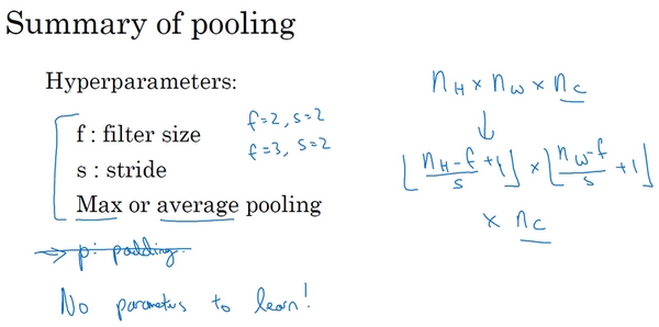 Pooling layers没有卷积运算,仅在滤波器算子滑动区域内取最大值,即max pooling,这是最常用的做法。超参数p很少在pooling layers中使用