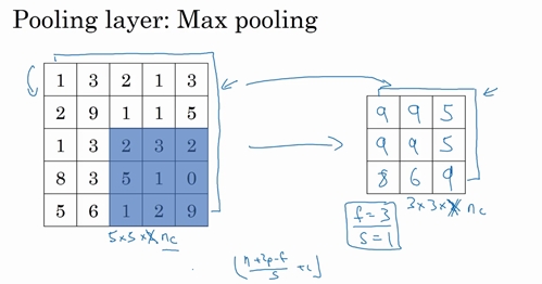 Max pooling的好处是只保留区域内的最大值(特征),数字大意味着可能探测到了某些特定的特征,忽略了其它值,降低了noise影响,提高了模型健壮性。max pooling需要的超参数仅为滤波器尺寸f和滤波器步进长度s,没有其他参数需要模型训练得到,计算量很小