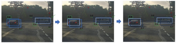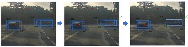 1.首先看哪个检测结果相关的概率(实际上是乘以、或)概率最大,右边车辆中是0.9,即最可靠的检测,用高亮标记,之后非极大值抑制逐一审视剩下的矩形,所有和这个最大的边框有很高交并比,高度重叠的其他边界框输出就会被抑制