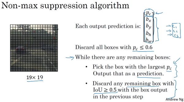 对象检测中的一个问题是算法可能对同一个对象做出多次检测,非极大值抑制可以确保算法对每个对象只检测一次
