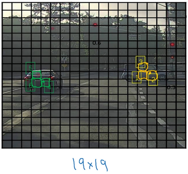 实践中当运行对象分类和定位算法时,对于每个格子都运行一次,编号1、2、3可能会认为这辆车中点应该在格子内部