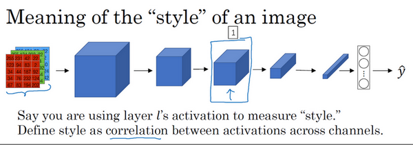 利用CNN网络模型,图片的风格可以定义成第l层隐藏层不同通道间激活函数的乘积(相关性)