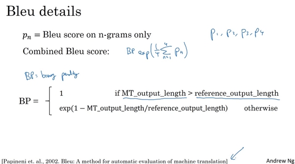 BLEU得分做的就是给定一个机器生成的翻译,它能够自动地计算一个分数来衡量机器翻译的好坏。只要机器生成的翻译与任何一个人工翻译的结果足够接近,那么它就会得到一个高的BLEU分数。BLEU代表bilingual evaluation understudy(双语评估替补)。且这些人工翻译的参考会包含在开发集或是测试集中