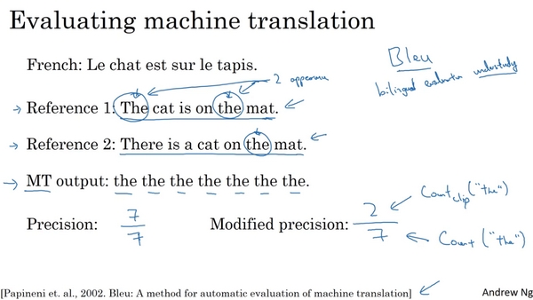 机器翻译(machine translation)的一大难题是一个法语句子可以有多种英文翻译而且都同样很好,常见的解决办法是通过一个BLEU得分(the BLEU score)的东西来解决,BLEU得分是一个有用的单一实数评估指标,用于评估生成文本的算法,判断输出的结果是否与人工写出的参考文本的含义相似