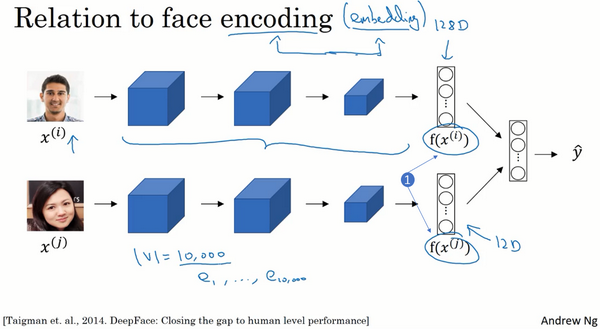 词嵌入和人脸编码有很多相似性,训练了一个Siamese网络结构,这个网络会学习不同人脸的一个128维表示,然后通过比较编码结果来判断两个图片是否是同一个人脸,在人脸识别领域用编码指代向量f(x(i)),f(x(j)),词嵌入的意思和这个差不多