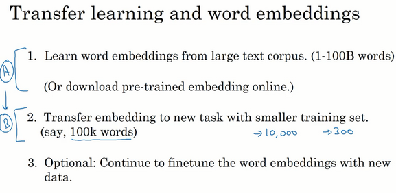 用这些词嵌入模型迁移到新的只有少量标注训练集的任务中,比如用300维的词嵌入来表示单词。好处就是可以用更低维度的特征向量代替原来的10000维的one-hot向量。尽管one-hot向量很快计算,但学到的用于词嵌入的300维的向量会更加紧凑