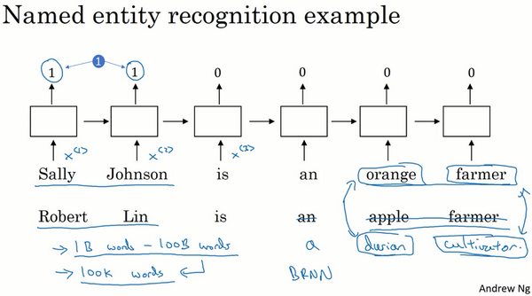 之前Named entity识别的例子(即找出语句中的人名),每个单词采用的是one-hot编码。RNN模型能确定Sally Johnson是一个人名而不是一个公司名,是因为“orange farmer”是份职业,很明显“Sally Johnson”是一个人名(输出1)