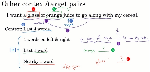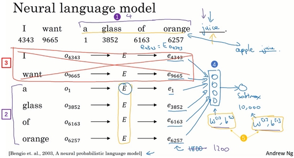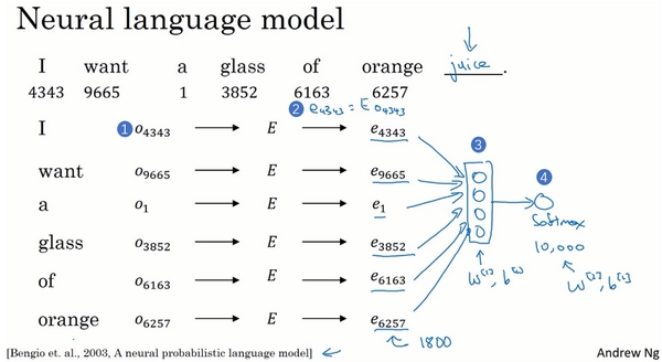 为了让神经网络输入层数目固定,可以选择只取预测单词的前4个单词作为输入,例如该句中只选择“a glass of orange”四个单词作为输入。这里的4是超参数,可调