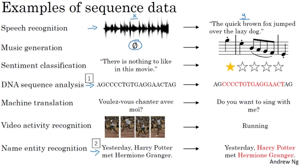 这些问题都可以被称作使用标签数据 作为训练集的监督学习。但序列问题有很多不同类型。有些问题里,输入数据 和输出数据都是序列,但就算在那种情况下,和有时也会不一样长。或者像上图编号1和编号2所示的和有相同的数据长度。在另一些问题里,只有 或者只有是序列