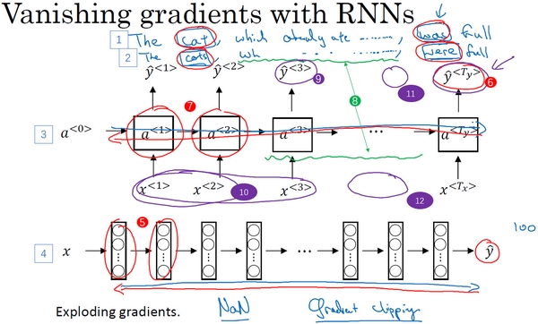 RNN反向传播很困难,会有梯度消失的问题,后面层的输出误差(编号6)很难影响前面层(编号7)的计算。即很难让一个神经网络能够意识到它要记住看到的是单数名词还是复数名词,然后在序列后面生成依赖单复数形式的was或者were。且在英语里面中间的内容(编号8)可以任意长,所以基本的RNN模型会有很多局部影响,输出主要受附近的值(编号10)的影响,编号6所示的输出很难受到序列靠前的输入(编号10)的影响,因为不管输出是什么,对的还是错的,这个区域都很难反向传播到序列的前面部分,也因此网络很难调整序列前面的计算