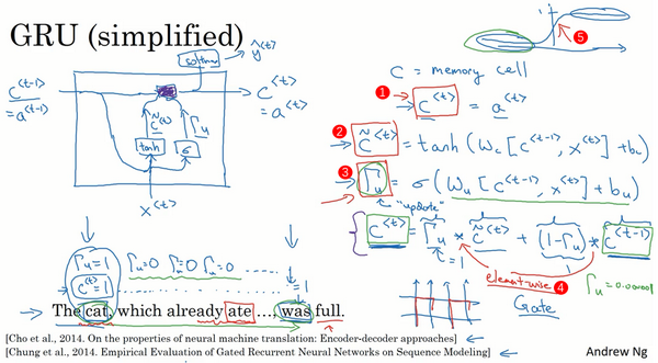 c~<t>=tanh(Wc[c<t−1>,x<t>]+bc) Γu=σ(Wu[c<t−1>,x<t>]+bu) c<t>=Γu∗c~<t>+(1−Γu)∗c<t−1> c<t−1>=a<t−1>,c<t>=a<t>。符号c表示记忆细胞的值,a表示输出的激活值,c~<t>是个候选值,替代了c的值,Γu(0到1)意为gate,u表示“update”,当Γu=1时,代表更新;当Γu=0时,代表记忆,保留之前的模块输出。Γu能够保证RNN模型中跨度很大的依赖关系不受影响,消除梯度消失问题
